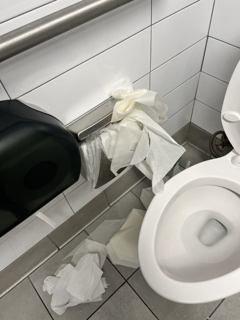 Both restrooms need attention. I highly doubt this happened right before you left for the day. Public restrooms present a certain health hazard naturally, but much more so if not checked on and cleaned regularly. If you saw it and chose to overlook it, then I have to question your own cleanliness and how you live.